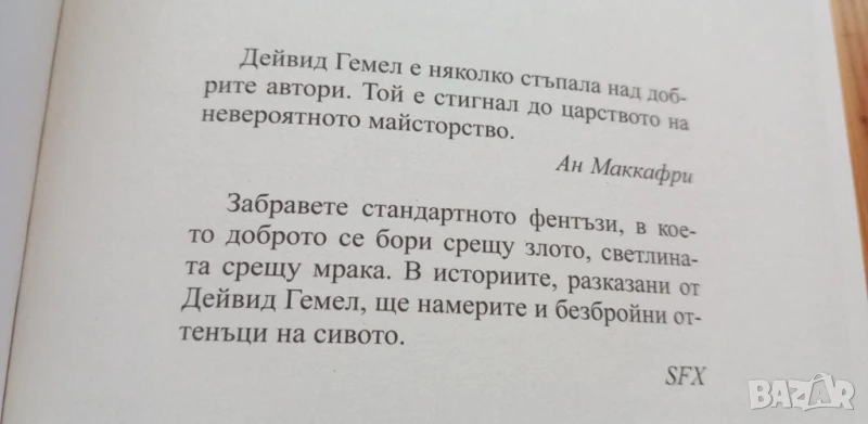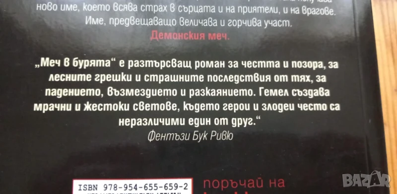 "Меч в бурята" е разтърсващ роман за честта и позора, за лесните грешки и страшните последствия от тях, за падението, възмездието и разкаянието. Гемел създава мрачни и жестоки светове, където опасности дебнат на всяка крачка и герои, и злодеи, които често са неразличими един от друг."