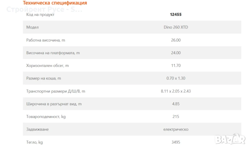Телескопична вишка на ремарке, DINO 260 XT - 26 метра Това е телескопична работна платформа, монтирана на ремарке за лек автомобил, за различни строително-ремонтни дейности с работна височина 26 м. Тази машина се характеризира с малкото си тегло и габарити и голямата височина, която достига. Лесното транспортиране и експлоатация на машината гарантират бързо и успешно свършена работа на иначе труднодостъпни и високи места. Машината се захранва на ток (230V и консумира 2kW) или чрез ДВГ на бензин (опция).