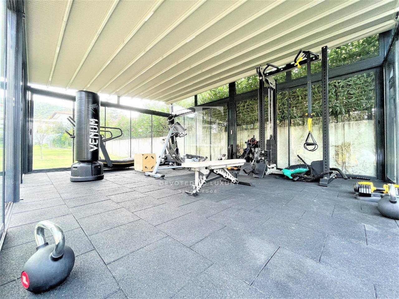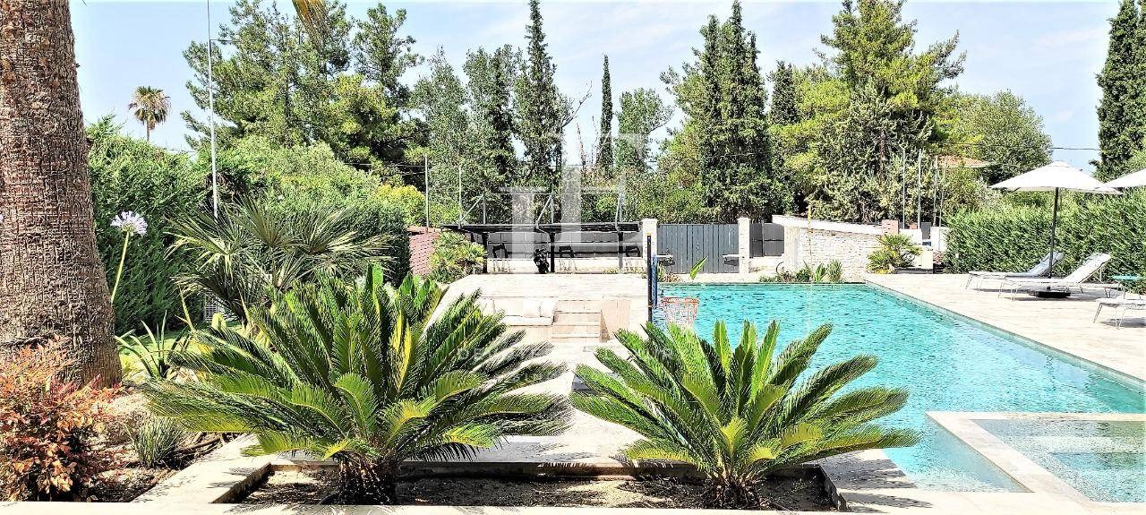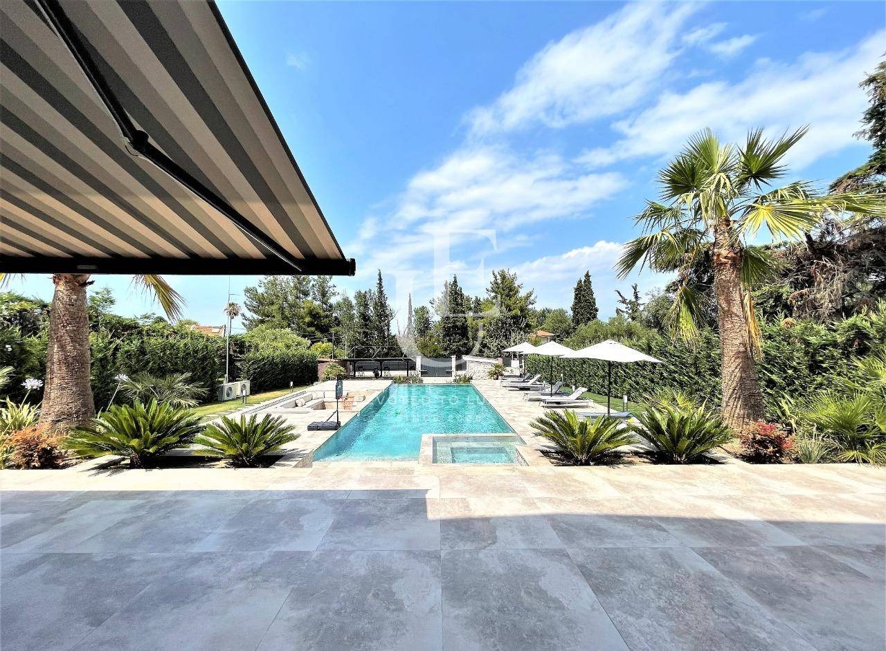 Имотът впечатлява с изключителна атмосфера на уединение и лукс, обграден от красиво оформен двор с площ от 4000 кв.м., осеян с зелени тревни площи, палми и цветна растителност. Външното пространство е създадено за пълен релакс и забавление на открито, като включва голям басейн и частен СПА център.