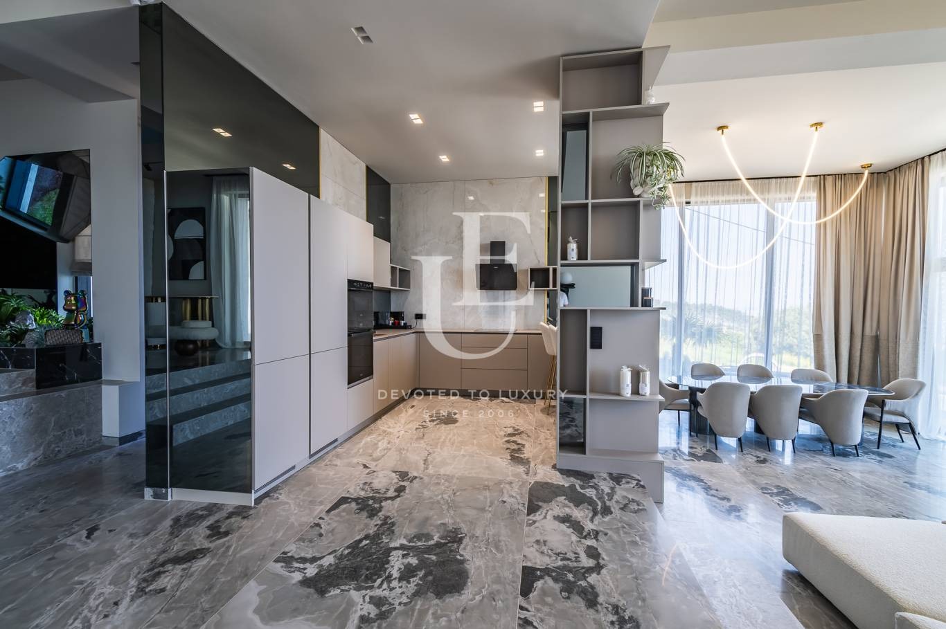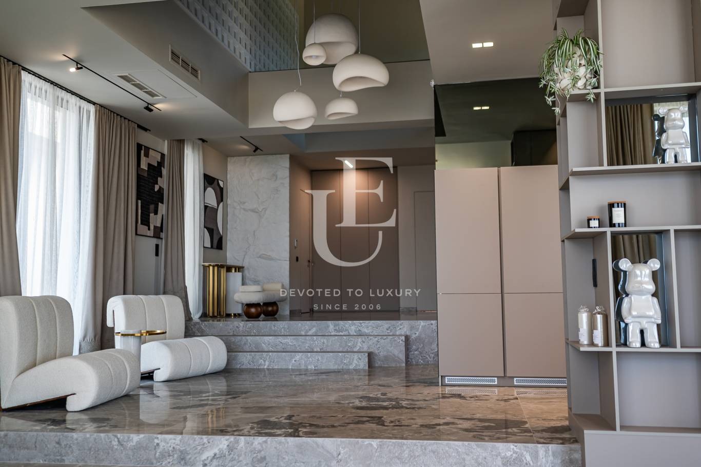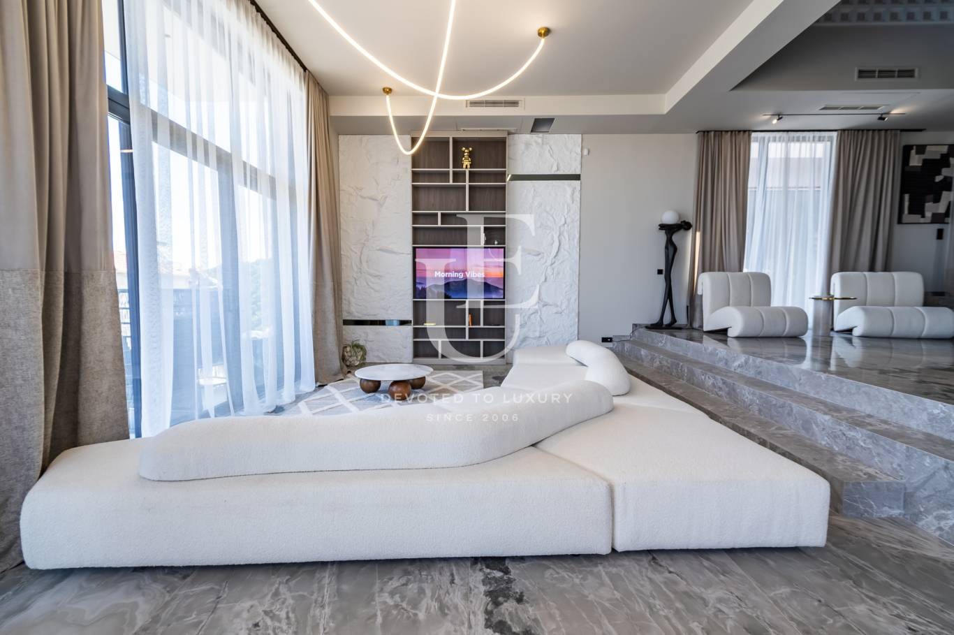 - първо ниво: просторна и осветена от естествена светлина дневна с трапезария, френски прозорци, тавани с височина 4.3 м, директен достъп до тераса от 42 кв.м, оборудвана с отопляем басейн с термопомпа и впечатляваща гледка към морето и околния природен ландшафт.