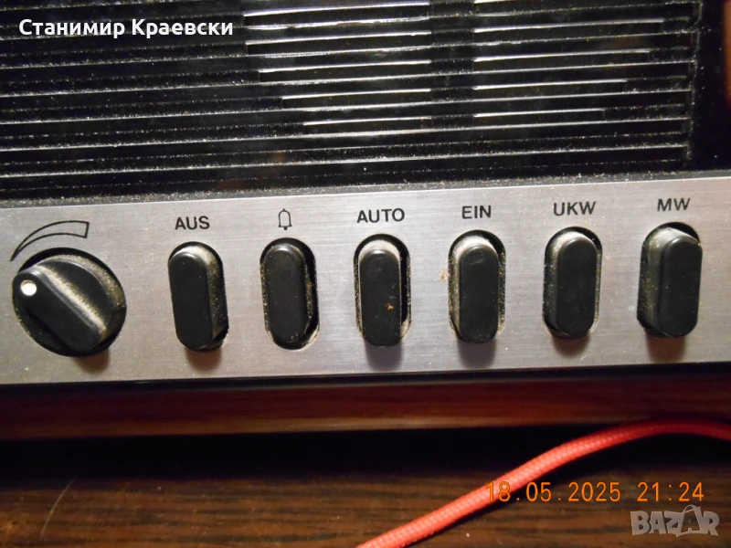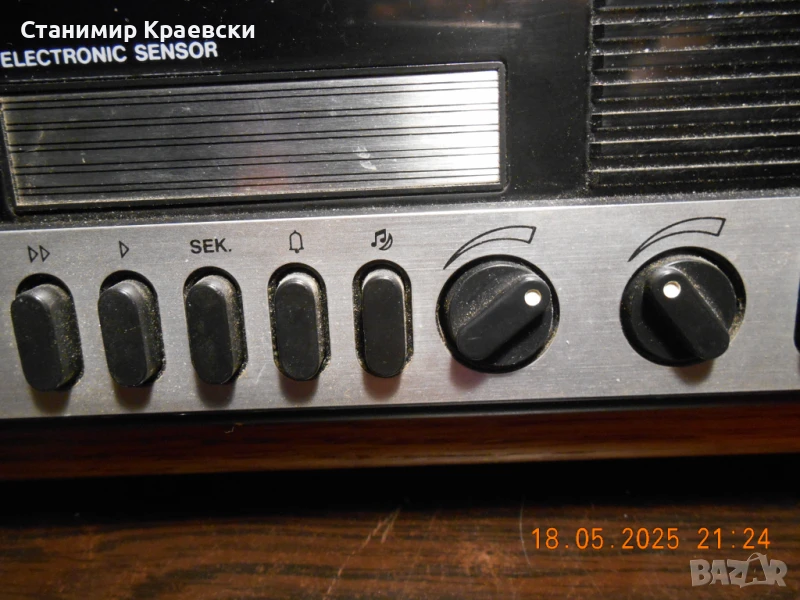 Радио часовника работи без проблеми.Ретро модел за вграждане в легло .Лично този съм го смъкнал от каравана .Дървената рамка е премахната /тежи много с нея/ Много добър външен вид Тример с димер Всички копчета са изправни Марката няма да коментирам