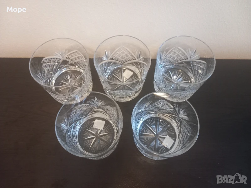 Пет броя кристални чаши за уиски с височина 8,2 см. диаметър на отвора 8 см. вместимост 250 мл. Чисто нови неизползвани 1 качество.