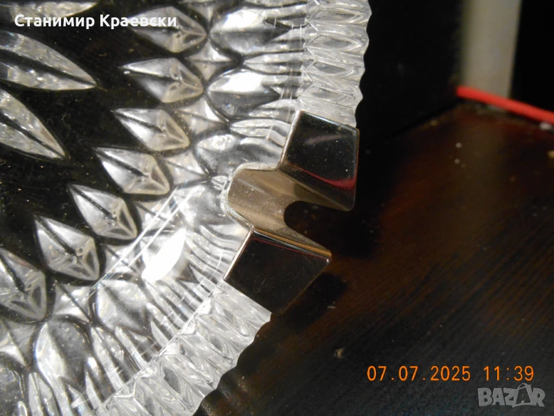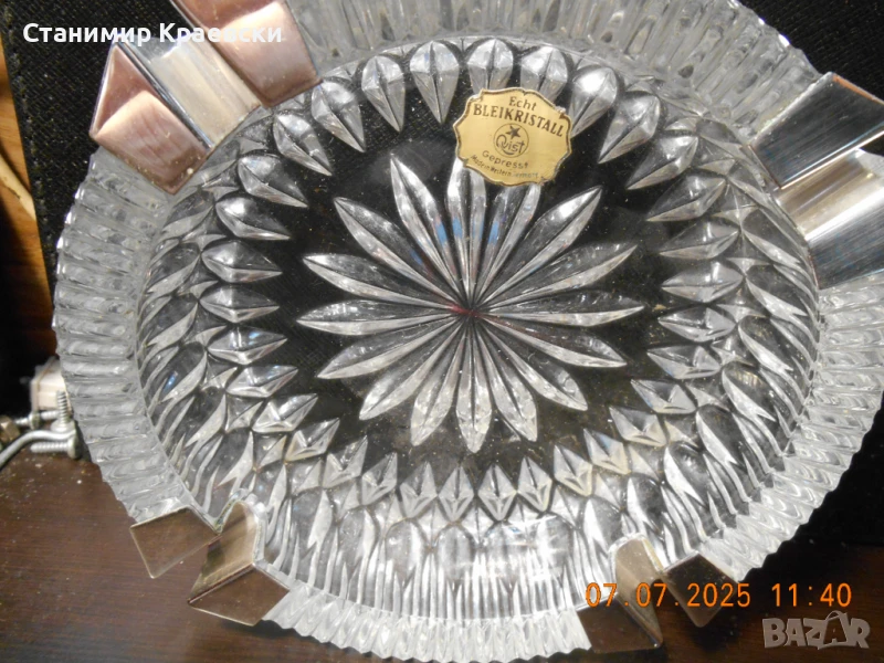 Кристален пепелник на само 55 години .Чисто нов без видими следи по нега и затова и пиша нов .Метални вложки с конус на мястото за цигарата.Красива декорация по целия пепелник .Оригинален етикет.