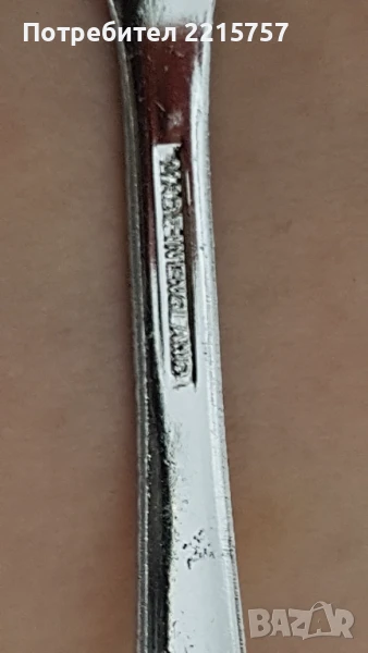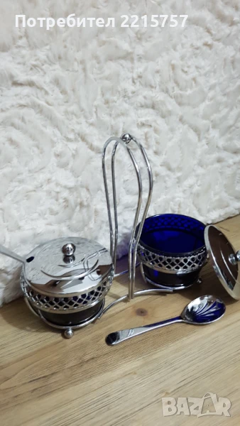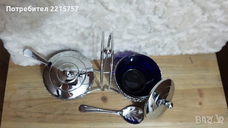 Английски комплект с хромирано покритие. Чашите от синьо стъкло вис.6см. В добро състояние. Има маркировка на лъжичките произвед. в Англия. Рр. вис.18/20см. Цена 66лв.