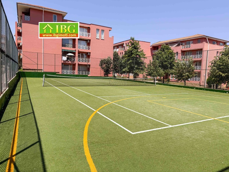 Разпределение: хол с кухня и трапезария, една спалня, балкон пред двете стаи с изглед към басейна и едното от комбинираните спортни игрища; баня с душ, тоалетна и мивка.