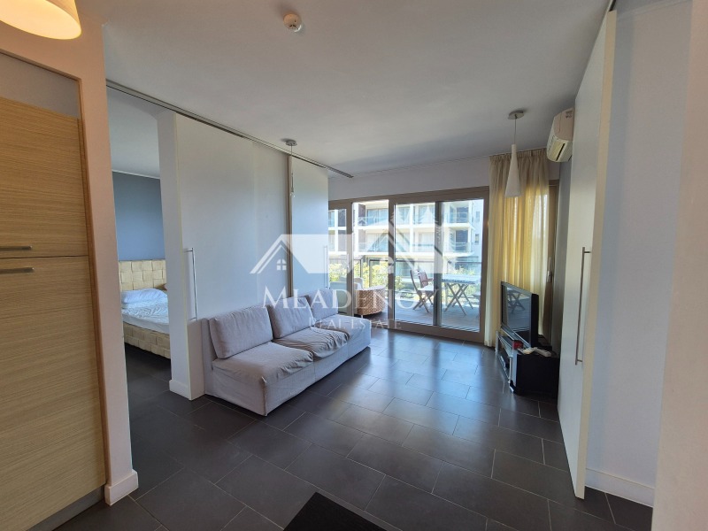 ГЛЕДКА МОРЕ в комплекс YooBulgaria-Obzor в гр. Обзор. Ваканционният комплекс Yoo е от затворен тип в крайбрежната зона на гр. Обзор, сред обширен парк, потънал в зеленина, с широка морска панорама. На територията на комплекса са изградени 4 басейна, детски басейн, детски площадки, тенис-кортове, фитнес-център и СПА-център, магазини, кафенета, барове и ресторанти. Достъпът до плажа е лесен и удобен. Имотът се намира на трети непоследен жилищен етаж и се състои от просторна всекидневна с кухненски кът, баня с тоалетна, две самостоятелни спални, едната от които има собствен санитарен възел, и огромна чудесно поддържана тераса. Стаите са с великолепни френски прозорци, като от всякъде се открива красива гледка към морето. Продава се с наличното обзавеждане и оборудване.