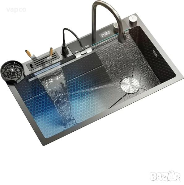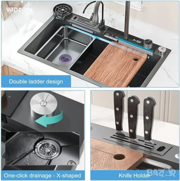 Мултифункционална кухненска мивка с двоен водопад и джоб за прибори