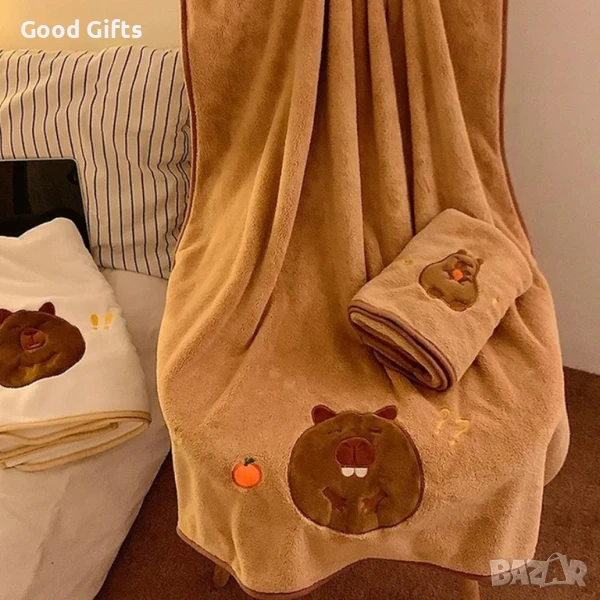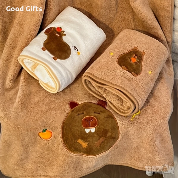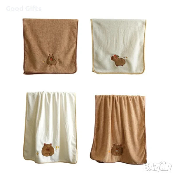 И двете части са в бежов цвят и разполагат с апликации на Капибара, което ги прави подходящи за деца или като забавен аксесоар за баня.