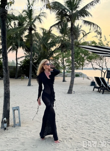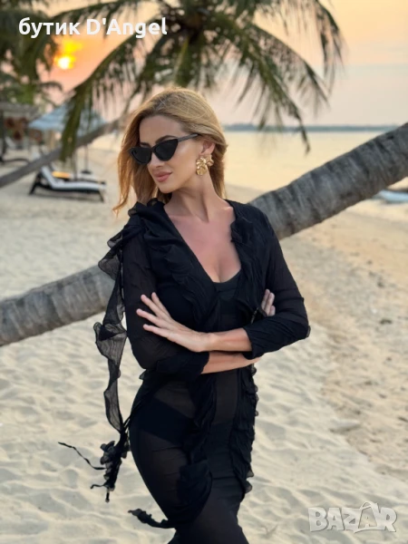 Ефектна, модерна, впечатляваща – рокля с прибран силует от иноватична материя подобна на намачкан шифон. Роклята е с кройка по тялото и голямо деколте с връзки и красиви къдри. Има лека прозрачност и може да се носи с бански или с къс корсаж вечерта. Една изключителна модна находка за Вашия гардероб.