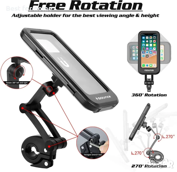 【Регулируемо завъртане на 360 градуса】: Регулируемият държач за телефон за велосипед и конекторът за кормилото са свързани чрез универсална сферична шарнирна връзка, което ви позволява да завъртате телефона си на 360 градуса до всякакъв ъгъл и височина, които отговарят на вашите предпочитания. Калъфът може лесно да се сваля от въртящата се сферична връзка, което ви позволява да го носите със себе си по всяко време.