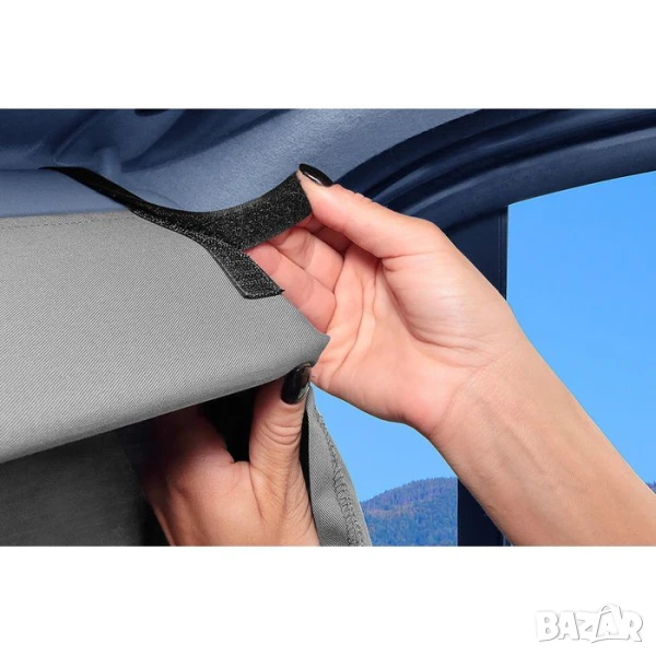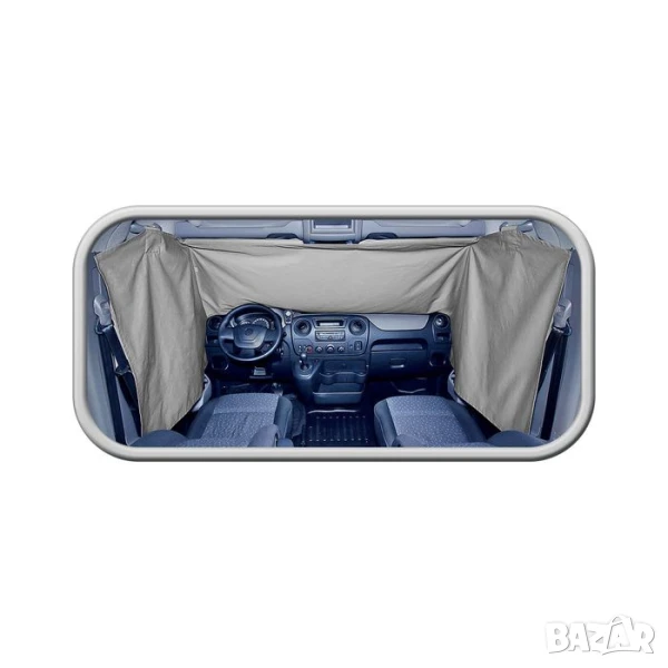 В горния ръб на калъфа има два джоба, които трябва да се поставят на сенниците над предното стъкло и да се закрепят на с помощта на пришити велкро ленти.