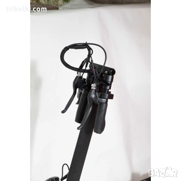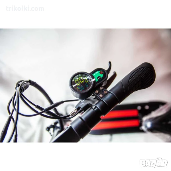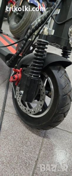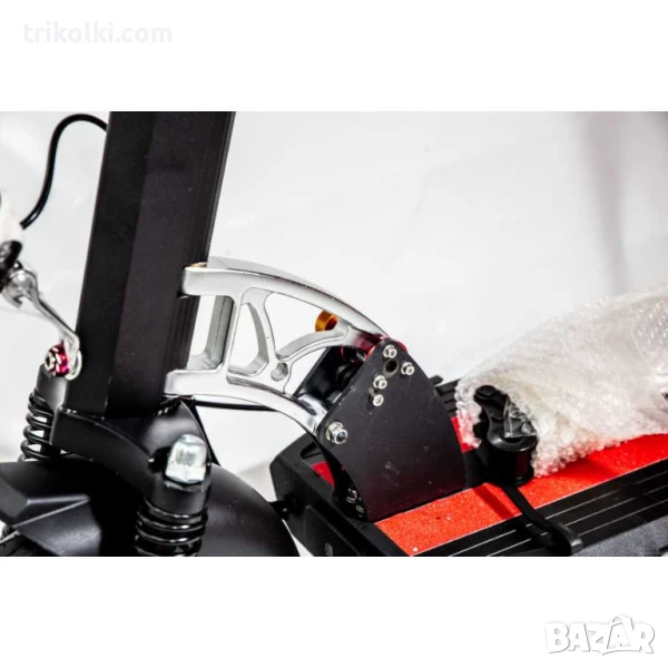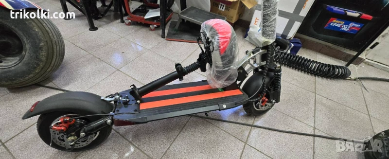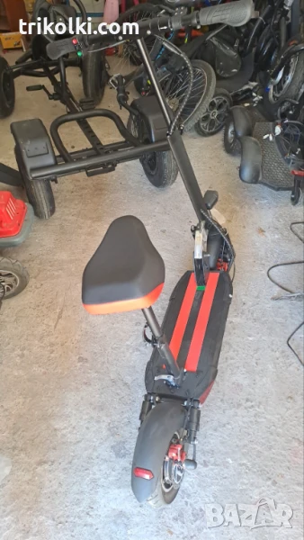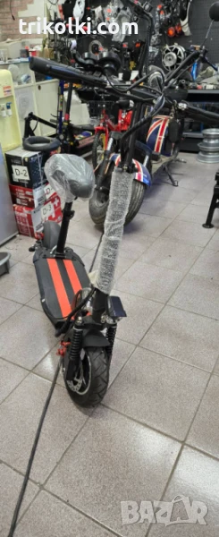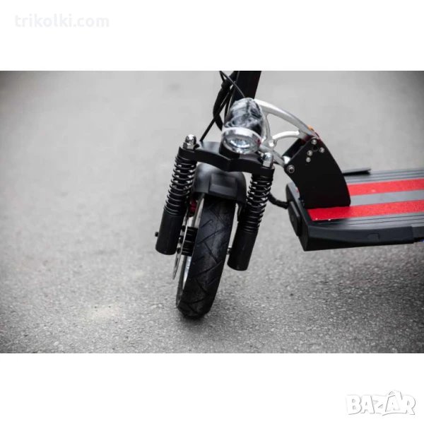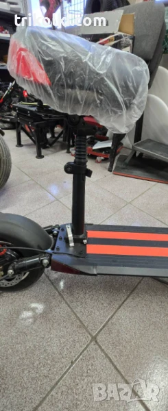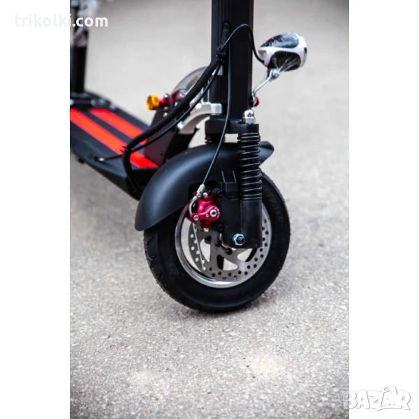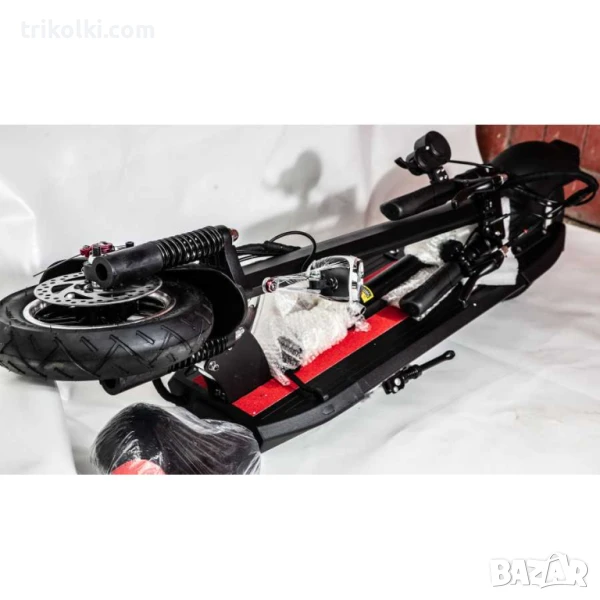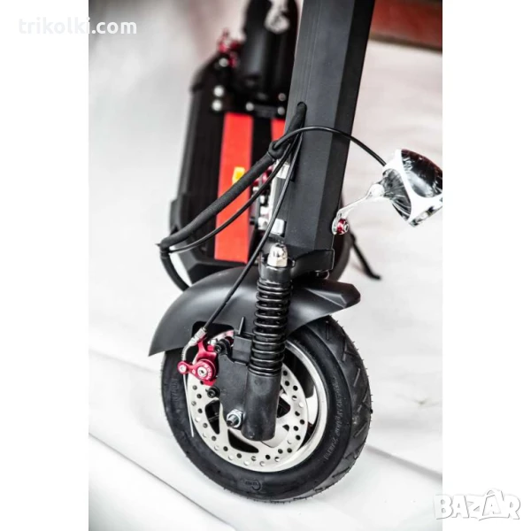 Нов модел, бърза, мощна и здрава. Страхотна сгъваема алуминиева електрическа тротинетка, изключително подходяща за удобно и бързо придвижване в градска и извънградска среда. Предна и задна дискова спирачка. Голямата литиево-йонна батерия (48V/10.4Ah), осигурява пробег до 50 км. Товароносимост до 150 кг. Максимална скорост 50 км/час. Светещ дисплей с километраж, 5 скорости и 5 режима на движение. Амортисьори на предното и задното колело и седалка. 10″ гуми, мигачи и стоп светлини, звукова сигнализация и LED подсветка на цялата платформа.Може да се сглоби със и без седалка!