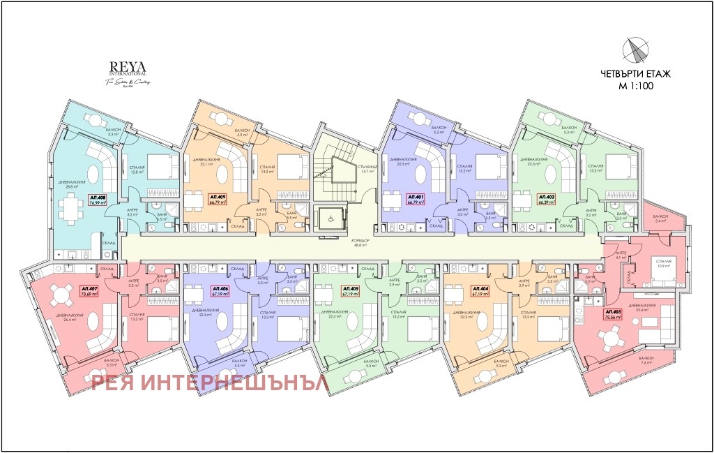 Разпределение: входно антре, дневна с кухненски бокс, спалня, тераса с излаз от двете стаи, баня с тоалетна, склад.