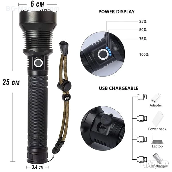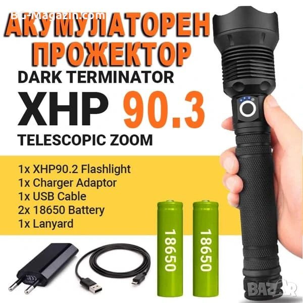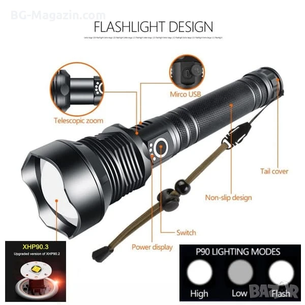 Този професионален тактически акумулаторен фенер LED прожектор е отличен избор за всеки, който търси надежден и многофункционален източник на светлина. Той е идеален за лов, риболов, планинарство и други дейности на открито, като ви осигурява необходимата сигурност и комфорт в тъмното.