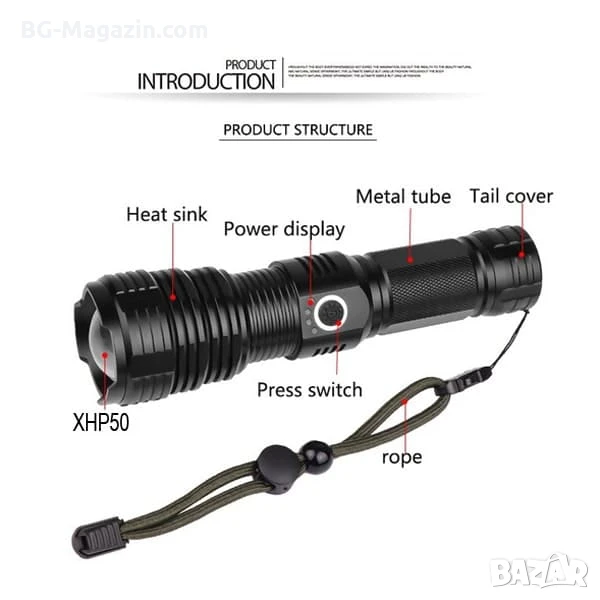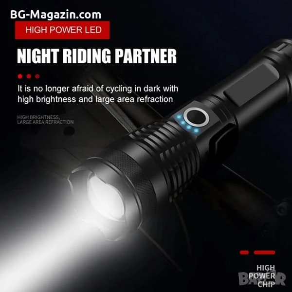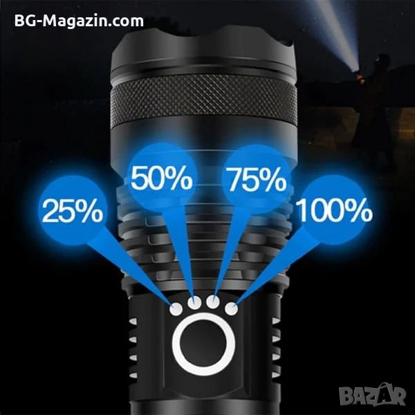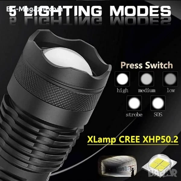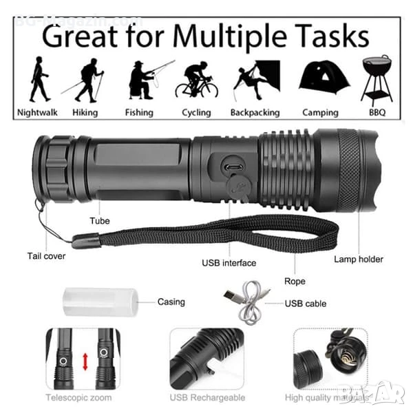Този мощен тактически фенер LED прожектор регулируем фокус е отличен избор за всеки, който търси надежден и многофункционален източник на светлина. Той е идеален за лов, риболов, планинарство и други дейности на открито, като ви осигурява необходимата сигурност и комфорт в тъмното.