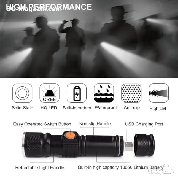 Този мощен ръчен акумулаторен лед фенер USB зареждане CREE LED е отличен избор за всеки, който търси надежден и удобен източник на светлина. Той е идеален за използване при различни дейности на открито и закрито, като ви осигурява необходимата сигурност и комфорт.