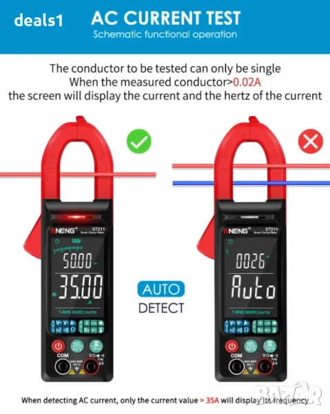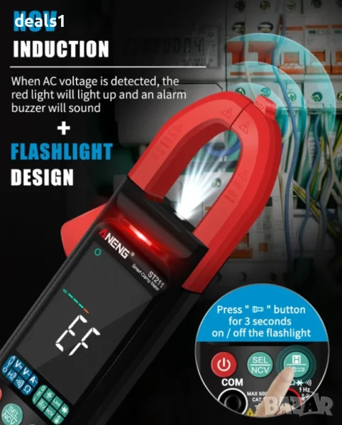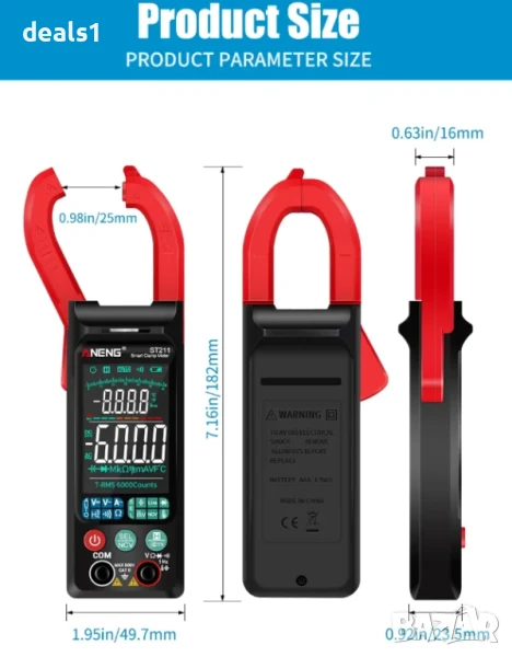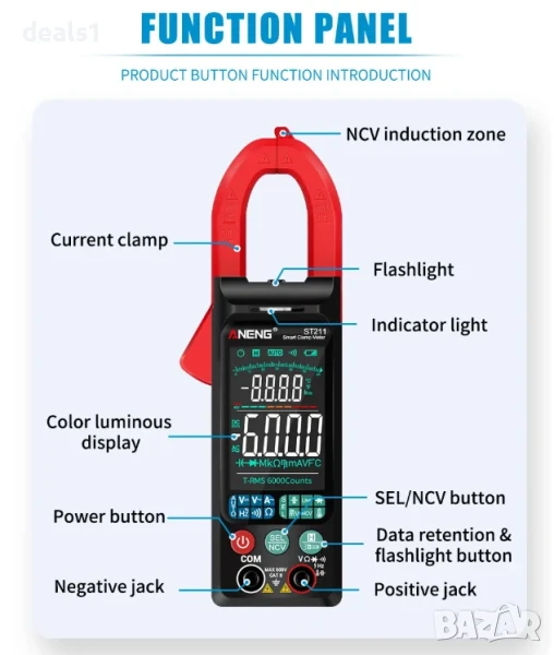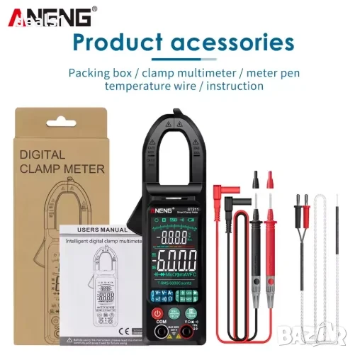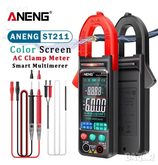 – Цифровият клещов мултиметър ANENG ST211 е прецизен и компактен инструмент с 6000 броя показания, голям цветен дисплей с подсветка, автоматичен избор на обхват и безконтактно откриване на напрежение (NCV).