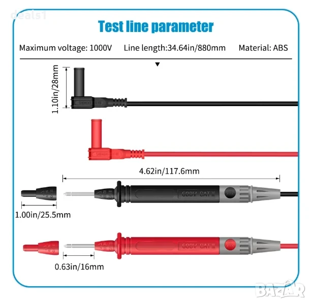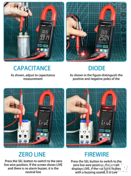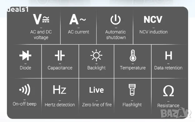 – Измерва AC/DC ток и напрежение, съпротивление, капацитет, честота и температура.