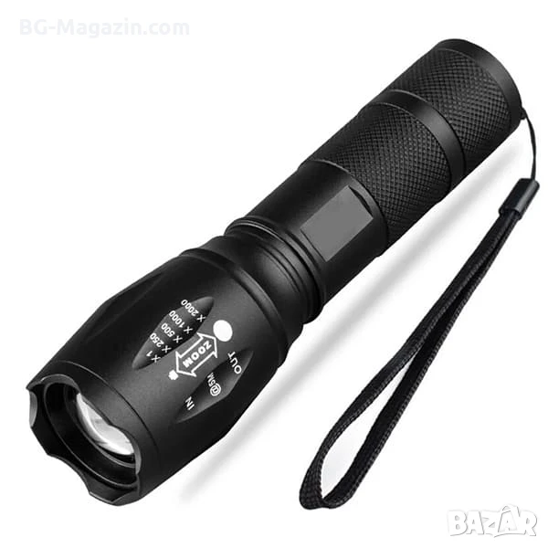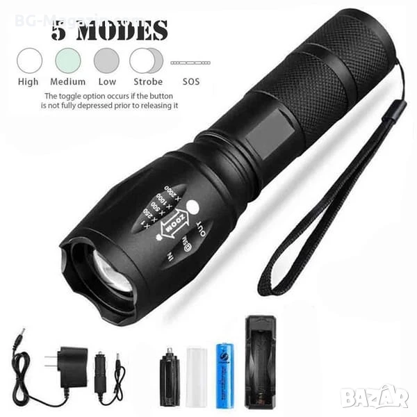 Режими на работа: 5 режима (100% силен, 50% среден, 30% нисък, Strobe, SOS)