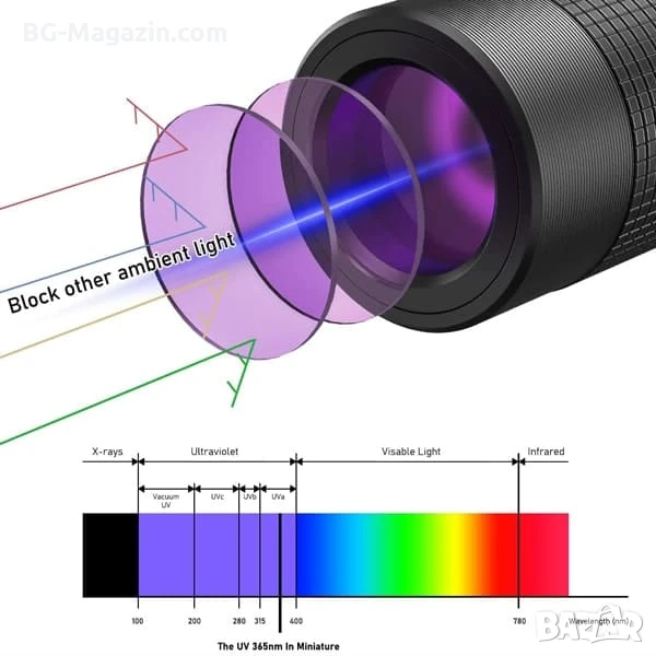 – Висока прецизност: Черният филтър гарантира, че само целевата UV светлина достига до обекта, осигурявайки точни резултати.