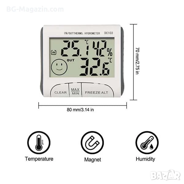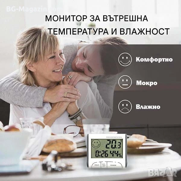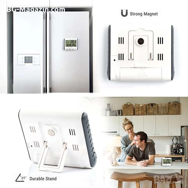 – Два в едно: Измерва както температурата (вътрешна и външна), така и влажността на въздуха, което ви дава пълна картина за климатичните условия.