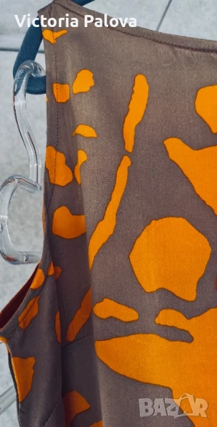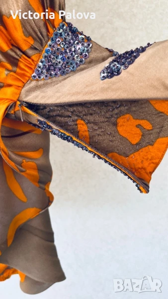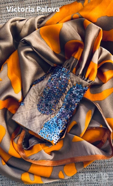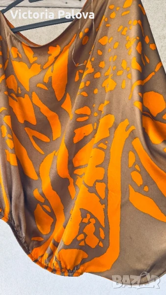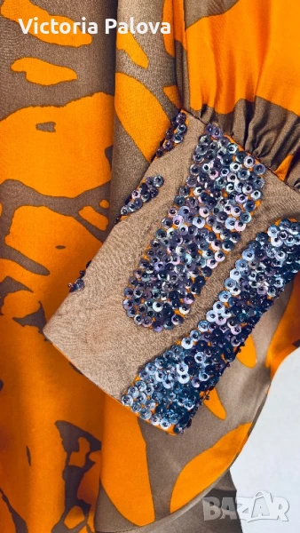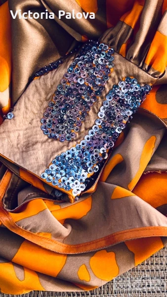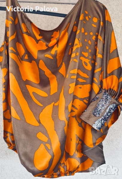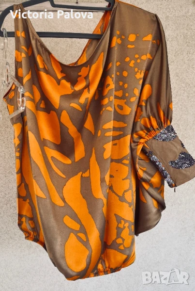 коприна с нежен блясък , интересен принт и кройка - едно рамо, второто се събира в ръкав с маншет ( с цип за добра фиксация). Блузата няма ограничение за размер, ГО се получава 96см, дължина - 68см, от средата на деколтето - 66см. Маншетът е акцент - декориран handmade, неочакван цвят на пайети , дълъг 16см, цип. Блузата е уникална , единствена, неповторима.