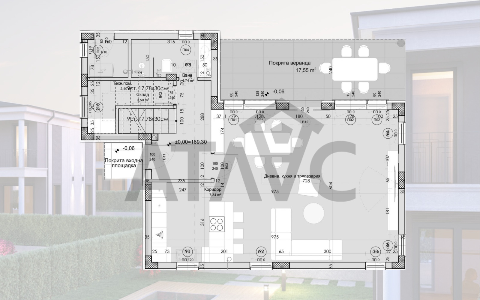 Етаж 1: Дневна, кухня и трапезария, баня с wc, веранда.
