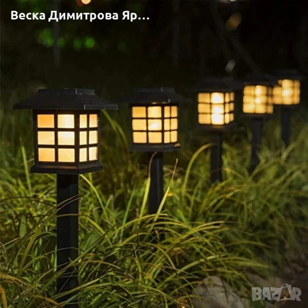 Тип продукт: Соларна лампа - 1бр;Материал: Устойчива пластмаса;Размери: 38 х 8 см;Светлинен ефект: LED, изкуствен пламък;Зареждане: Слънчево;Батерия: 1 x Ni-MH 1.2V AAA акумулаторна батерия (вградена);Капацитет на батерията: 600mAh;Работно време: > 6 часа след пълно зареждане;Автоматична работа: Включване при здрач, изключване при изгрев;Водоустойчивост: Подходяща за външни условия;Гаранция: 12 месеца.