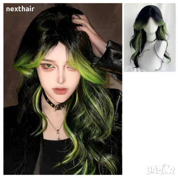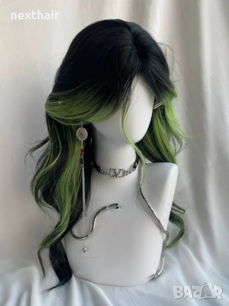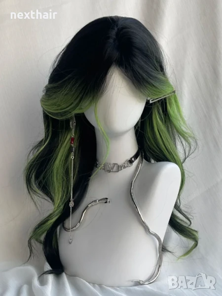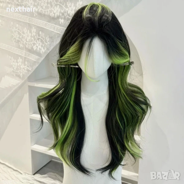 Черна чуплива перука с лимонено жълти кичури → Обява 51029919