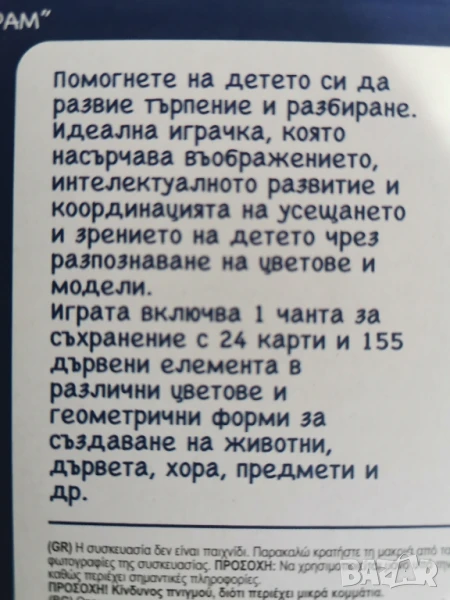 Цветтен пъзел "Танграм". Играта включва 1 чанта за съхранение на карти и 155 дървени елемента в различни цветове и геометрични форми за създаване на животни, дървета хора, предмети и други. Подходяща е за деца над 3 години. Изпращам с Еконт или Спиди с опция преглед.