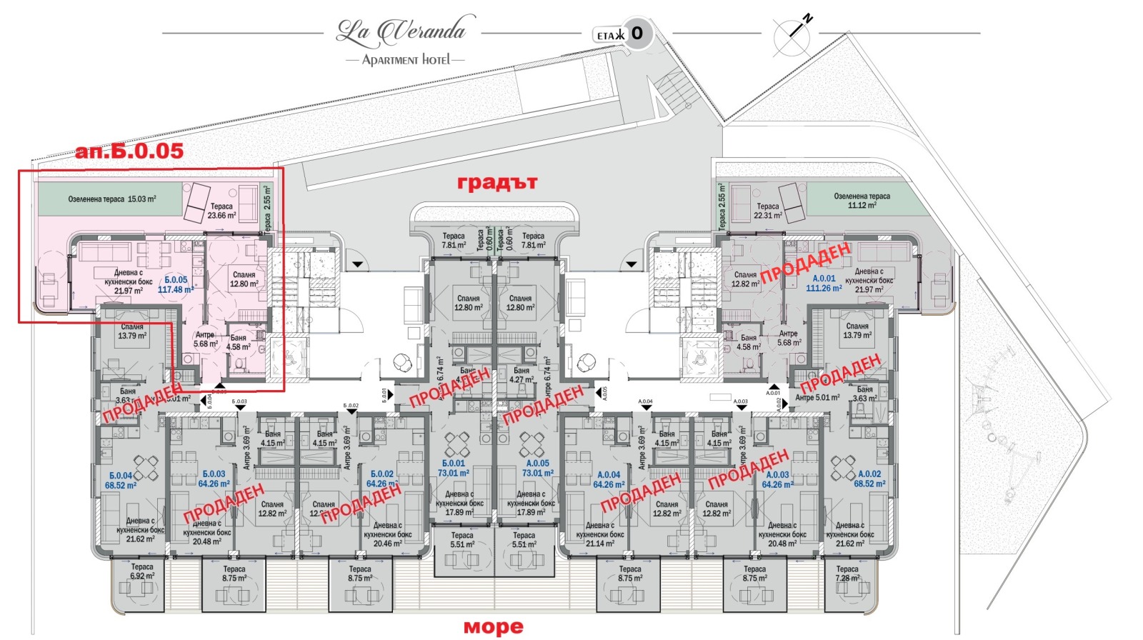 🌳 Площ на терасата: 41,24 кв.м. Терасата предлага както странична гледка към морето, така и към тиха градска уличка. Можете да я обзаведете с