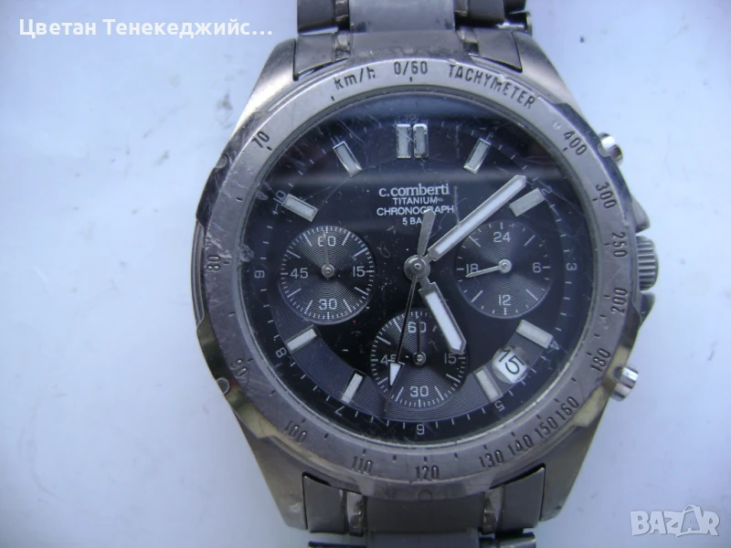 2.Кварцов часовник C.Comberti Chronograph.Работи точно.Всички малки стрелки са активни.Датник.Титан.Диаметър на касата без коронката 39,8мм.Оригинална метална верижка-40лв.