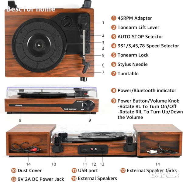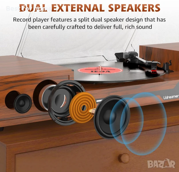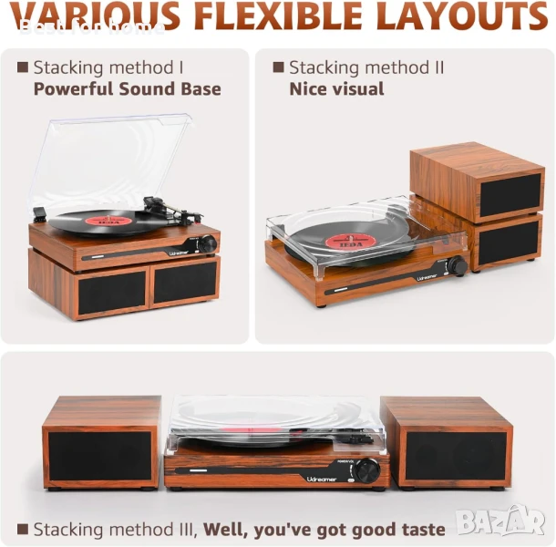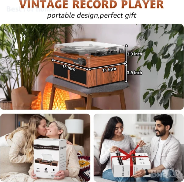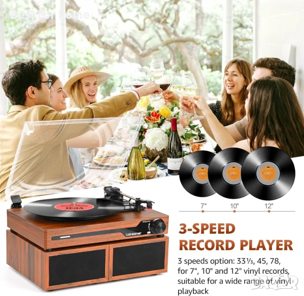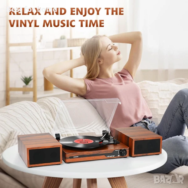 - 【Грамофон с 3-скоростна ремъчна предавка】Винилов грамофон с три регулируеми скорости: 33⅓, 45, 78, за 7", 10" и 12" винилови плочи, също така се предлага с адаптер за 45 оборота в минута. Трите регулируеми скорости правят грамофона подходящ за широк диапазон от възпроизвеждане на плочи.