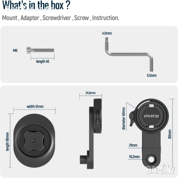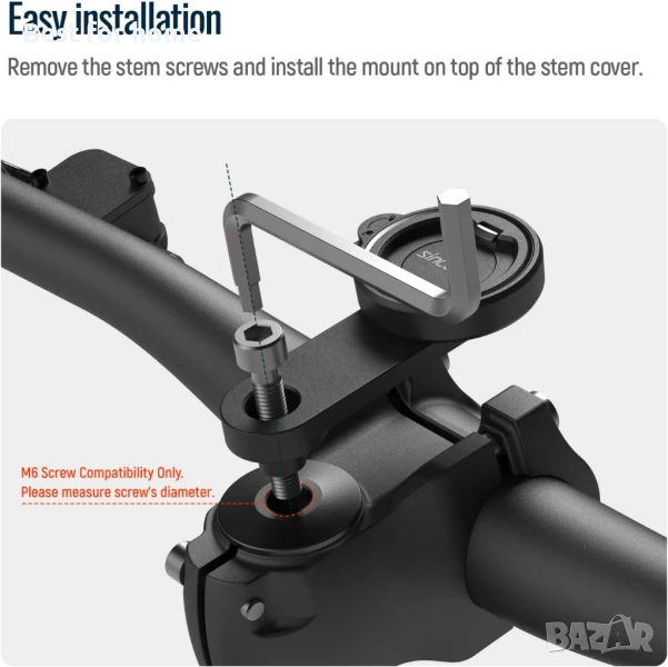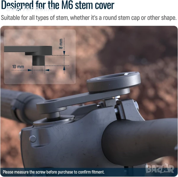- 【Специално за винтове M6 за велосипеди】: Независимо дали капакът на STEM на вашия велосипед е кръгъл или с друга форма, този държач за телефон може да го поддържа перфектно. Височината на цилиндъра от алуминиева сплав на опората е 8,0 мм, което може да се приложи към стъпалата на винтовете M6 на различни STEM капаци, за да се избегне окачването на дъното на цилиндъра и стъпалата на винтовете след монтажа на стойката. Забележка: този продукт е подходящ само за велосипеди (винтове M6), а не за мотоциклети. Повечето винтове за мотоциклети са M8, ако спецификацията на вашия винт е M8, моля, изберете нашата друга версия/модел M8.