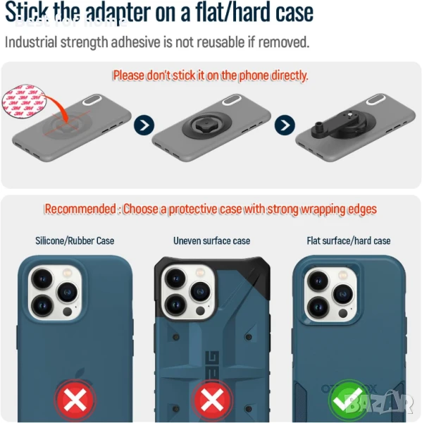 - 【Универсални адаптери】- Нашата стойка за телефон и велосипед се предлага с един универсален адаптер, двустранно залепващата лента с висок вискозитет от индустриален клас 3M може да се залепи здраво за повечето калъфи за мобилни телефони. Вече можете да използвате телефона си за навигация или Bluetooth високоговорителя си, за да се наслаждавате на музика. Моля, обърнете внимание, че калъфите със силиконово/гумено/меко покритие не са подходящи за този адаптер!!!!!