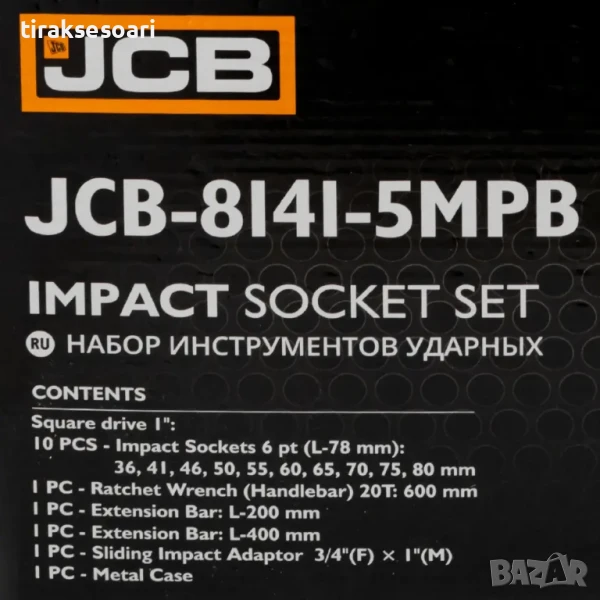гедоре 1 инч, ударни вложки, комплект вложки 36-80 мм, гедоре JCB, JCB 8141-5MPB, ударен комплект, гедоре с вложки, професионален гедоре комплект, 1" гедоре с накрайници, автоинструмент, тежкотоварен инструмент, ударни вложки за камион, гедоре за сервиз