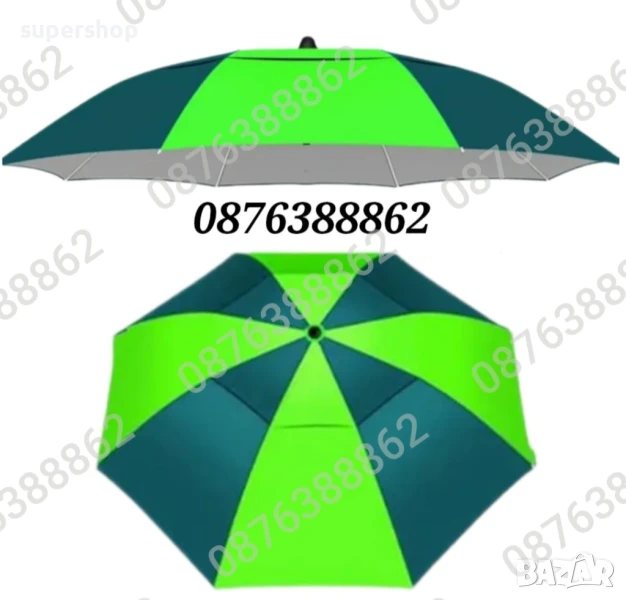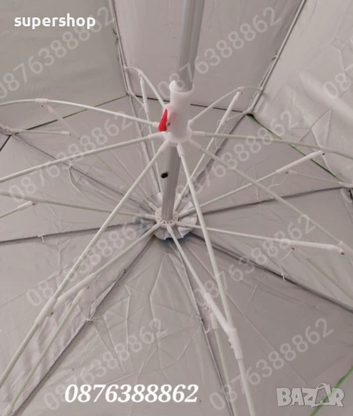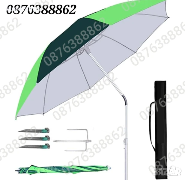 ПРОМОЦИЯ! Плажен чадър с чупещо рамо, УВ защита, калъф, колчета, тризъбец 190см.