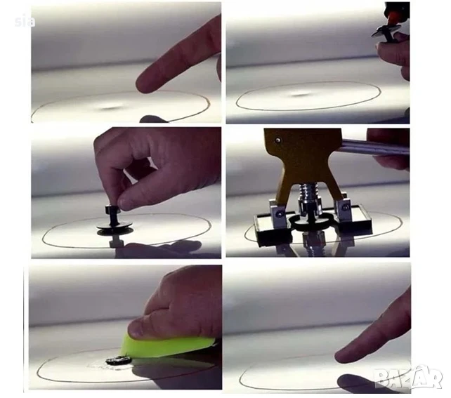 Комплектът за отстраняване на вдлъбнатини се състои от висококачествен инструмент за издърпване и аксесоари/приставки с различни размери. Позволява Ви ефективно и прецизно премахване на вдлъбнатини по каросерията на превозните средства, без да е необходимо боядисване. Това е идеалното решение за вдлъбнатини от градушка, удари или други случайни повреди.