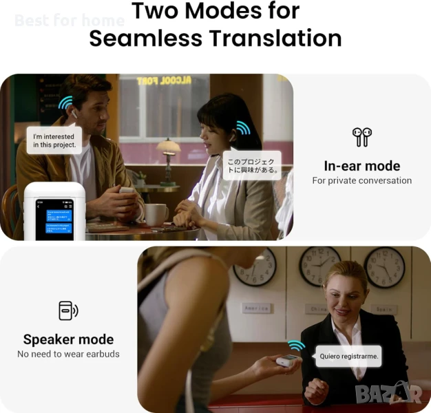 Режими за слушалки в ушите и с високоговорител: Лесно превключвайте между режим за слушалки в ушите за лични разговори и режим с високоговорител за шумна среда, благодарение на мощния 2W високоговорител. Насладете се на ясни преводи и подобрено музикално изживяване, което прави тези слушалки за превод идеални за всяка ситуация.
