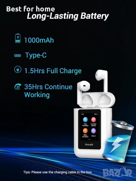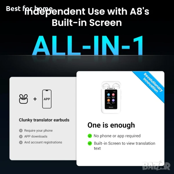 Наистина независима работа: За разлика от 99% от слушалките за превод, зависими от приложения на пазара, A8 TransBuds работят изцяло самостоятелно. С вграден сензорен екран, тези слушалки за превод осигуряват плавни и незабавни преводи - не е необходим смартфон или външни приложения.