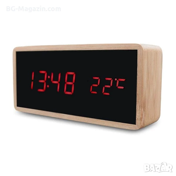 Декоративен LED настолен часовник дървен с термометър – компактен и функционален уред, който ще ви държи информирани за времето, датата и температурата във вашия дом или офис. Със своя стилен дизайн, имитиращ бамбук, голям LED дисплей и множество удобни функции, този часовник е идеалният аксесоар за всяко помещение.
