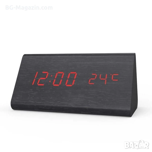 – Уникален и стилен дизайн: Триъгълната форма и имитацията на дърво придават на часовника естествена и елегантна визия.