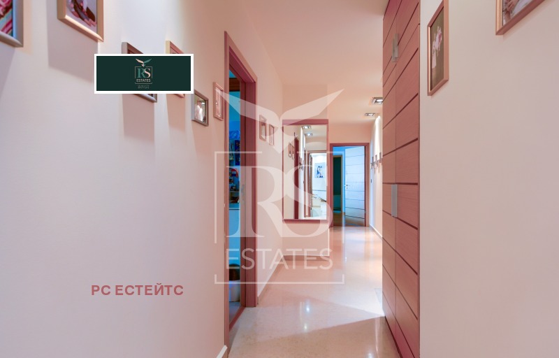 Разпределение: входно антре, просторна дневна с напълно оборудвана кухня с барплот, трапезария с камина, четири просторни спални, обособени последователно по дълъг коридор, като всяка е със самостоятелен санитарен възел. Спалните са със средна площ около 25 кв.м., като всяка стая разполага с голям вграден гардероб. Апартаментът е завършен с висококачествени материали и оборудван с висок клас мебели.