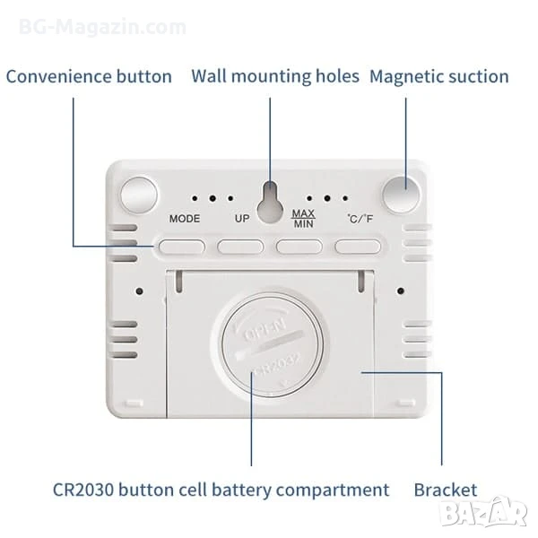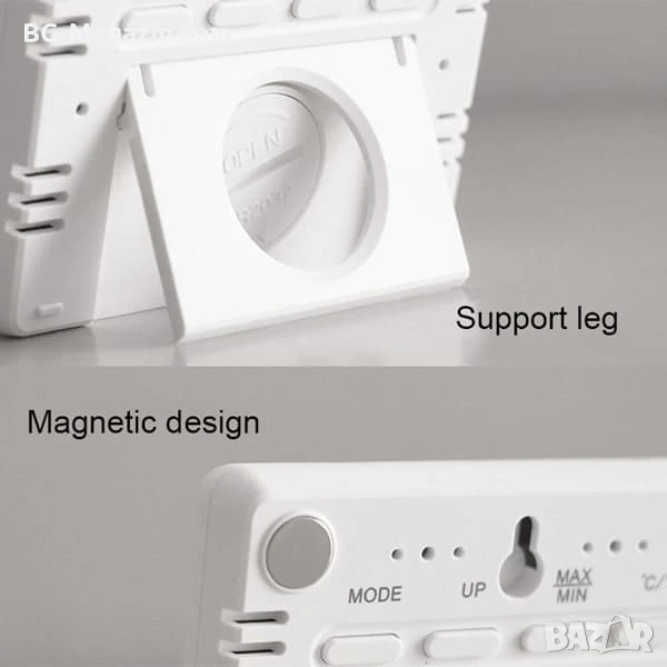 – Възможност за поставяне на различни места: Може да бъде поставен на стена, на маса или прикрепен с магнит към метална повърхност (например хладилник).
