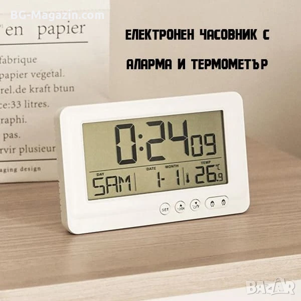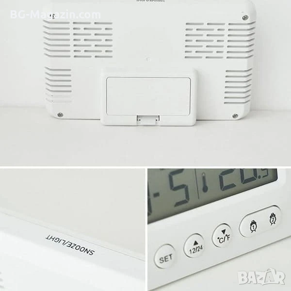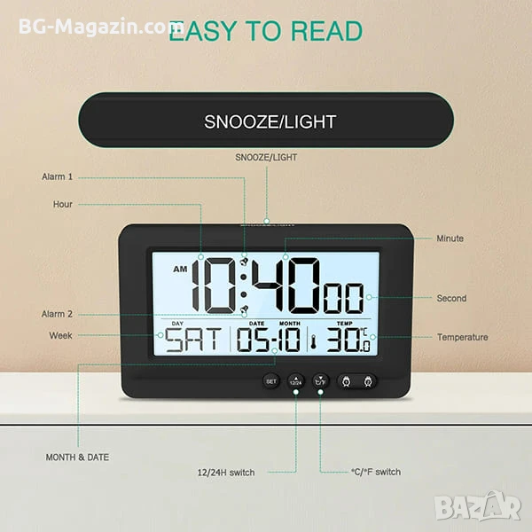 – Многофункционалност: Часовникът предлага широк набор от функции, включващи показване на час (в 12/24-часов формат), дата, температура (°C/°F), аларма (двойна) и режим на дрямка.