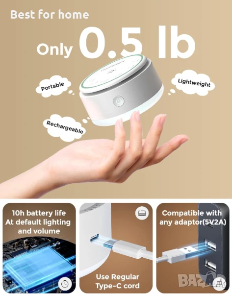 【Регулируема сензорна лампа】Тази лампа е снабдена с главен превключвател, който служи и като източник на светлина, което ви улеснява да откриете своя бял шум през нощта. Просто докоснете горната част, за да включите светлината, и задръжте, за да регулирате плавно яркостта. С две обръщаеми страни, обръщането на лампата нагоре увеличава максимално яркостта, отговаряйки на вашите нужди за различни настройки на светлината.