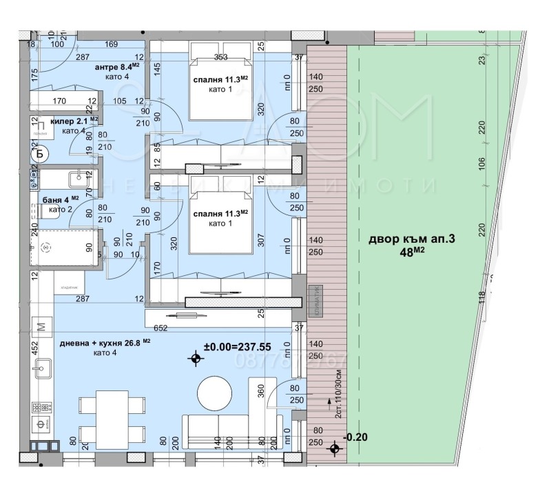 Състоящ се от => всекидневна с кухненски бокс, две спални, килер, баня с тоалетна, двор с площ - 48кв.м., квадратура на апартамента - 89кв.м..