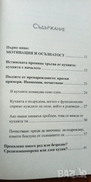 Книгата не е просто наръчник, а малък трактат по психология, който обяснява защо ако искаме да променим нас самите, трябва да започнем промяната от тази стая. Тя ни учи как да го направим чрез поредица от прости и функционални съвети, тръгвайки от един основен принцип: в кухнята командва само един.
