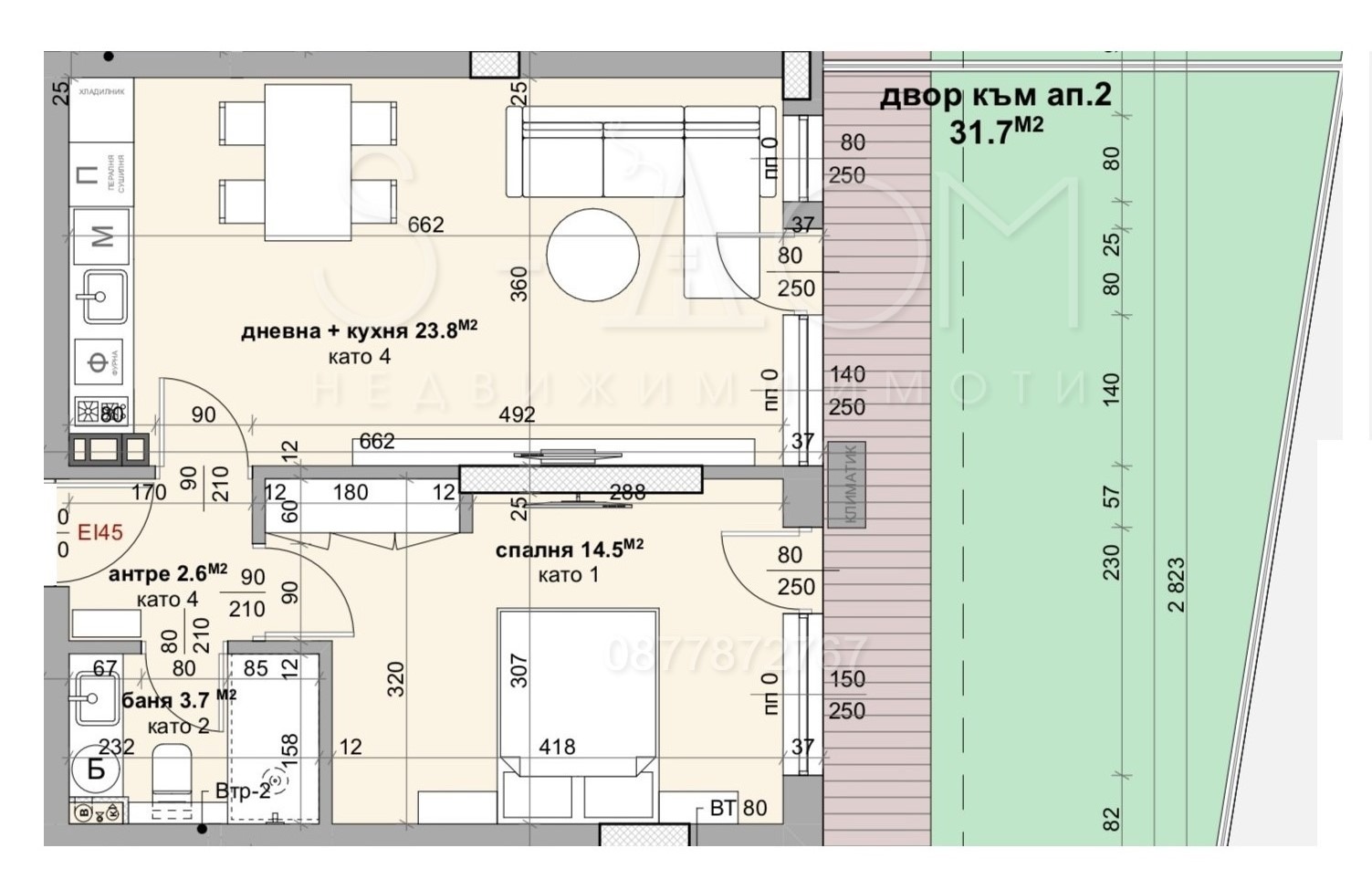 Състоящ се от => всекидневна с кухненски бокс, спалня, баня с тоалетна, двор с площ - 31,70кв.м., квадратура на апартамента - 61кв.м..