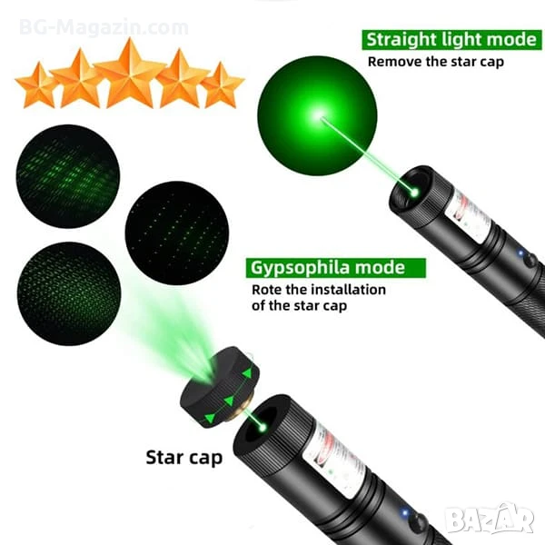 Този акумулаторен лазер зелен пойнтер предлага впечатляваща яркост и възможност за регулиране на лъча, което го прави подходящ за различни дейности. Моля, използвайте го с повишено внимание и спазвайте инструкциите за безопасност.